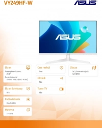 Stílusos 23,8" ASUS VY249HF-W monitor IPS panellel és 100 Hz frissítési frekvenciával a folyamatos képért, széles betekintési szögekkel és valósághű színekkel munkához és szórakozáshoz egyaránt. A Full HD felbontásnak és a fehér, modern dizájnnak köszönhetően kiváló választás irodai és otthoni asztalra is.