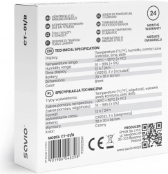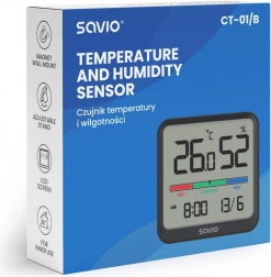 A SAVIO CT-01 egy praktikus beltéri digitális hőmérő és páratartalom-mérő áttekinthető LCD-kijelzővel, amely megjeleníti a hőmérsékletet, a páratartalmat, az időt és a dátumot. Nem hiányzik a komfortjelző (Dry/Comfort/Wet), a mágneses fali tartó és a kihajtható támasz a rugalmas elhelyezéshez otthon és irodában.