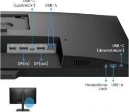 A monitort hosszan tartó munkavégzésre tervezték. Az ergonomikus állvány támogatja a −5°‑tól 15°‑ig terjedő döntést, ±20°‑os elfordítást és 90°‑os pivotot álló tájoláshoz. A bőséges csatlakozók között USB‑C, HDMI, DisplayPort (in/out) a több kijelző egyszerű láncolásához, USB‑A hub a perifériákhoz és fejhallgató‑kimenet található.