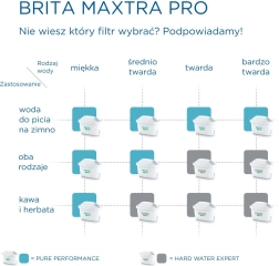 A BRITA MAXTRA PRO Hard Water Expert patron kemény és nagyon kemény vízű területekre készült. A továbbfejlesztett szűréstechnológiának köszönhetően jelentősen hatékonyabb vízkeménység-csökkentést ér el, javítja a víz ízét és illatát, valamint meghosszabbítja a háztartási készülékek élettartamát. Kompatibilis az Aluna, Marella, Style, Elemaris, Flow kollekciók BRITA kancsóival, valamint az üveg Glass kancsóval.