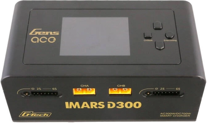 A Gens Ace IMARS D300 G‑Tech egy intelligens AC/DC töltő, amely G‑Tech Eco és hagyományos akkucsomagokhoz készült. Automatikusan felismeri a G‑Tech akkumulátor típusát, a feszültséget és az ajánlott töltőáramot, így a töltés gyors, pontos és biztonságos. A két független csatorna lehetővé teszi két akkumulátor egyidejű töltését, akár AC 300 W vagy DC 2×350 W teljesítménnyel.