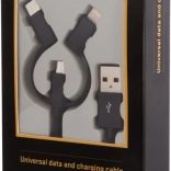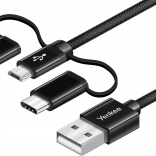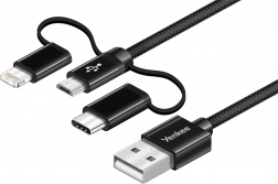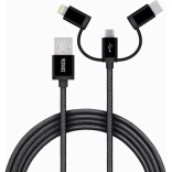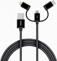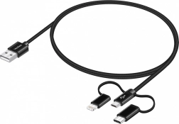 A kábel három csatlakozóval rendelkezik – USB-C, Micro USB és Lightning –, így számos eszközzel kompatibilis.