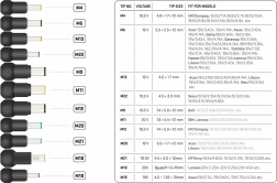 M4-től M19-ig terjedő tippeket tartalmaz, részletes specifikációkkal, mint a feszültség és kompatibilis notebook modellek.