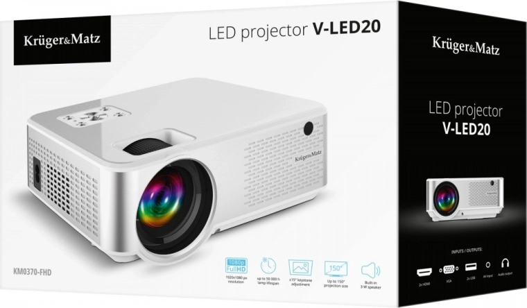 A Krüger & Matz LED projektor 1920 x 1080 pixeles felbontásával nagyszerű otthoni mozi élményt nyújt. Az 1,5 és 3,5 méter közötti vetítési távolságnak köszönhetően könnyen igazíthatod a vetítés méretét 15 és 150 hüvelyk között bármilyen helyiséghez.
