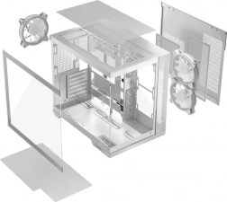 Fehér számítógépház Volcano Panorama APEX ARGB 3F MIDI ideális választás azoknak, akik optimalizálni szeretnék a hűtést és egyúttal teljes pompájában szeretnék megmutatni komponenseiket. Üveg panelek és ARGB ventilátorok modern megjelenést kölcsönöznek, miközben a megfordított csatlakozóval rendelkező alaplapok szerelési lehetősége rugalmasságot biztosít a haladó konfigurációkhoz.