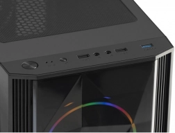 Három elülső RGB ventilátor és az átlátszó oldallap kiemeli az alkatrészeket, és markáns gamer stílust kölcsönöz a gépnek.