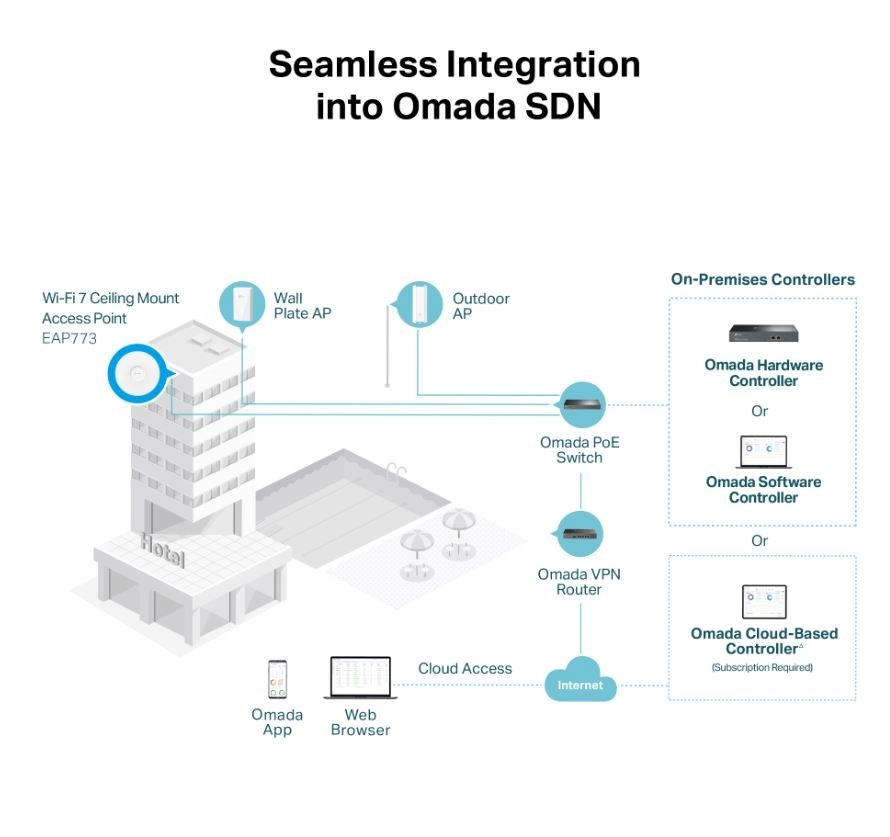 A TP‑Link EAP772 BE9300 modern, beltéri vállalati hozzáférési pont, amely kiaknázza a Wi‑Fi 7 teljes potenciálját. Háromsávos felépítése és akár 320 MHz csatornaszélessége jelentősen nagyobb kapacitást és alacsonyabb késleltetést biztosít – ideális igényes alkalmazásokhoz, videókonferenciákhoz és nagy adatforgalomhoz késleltetés nélkül.