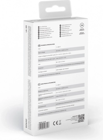 A Savio töltő 20 W teljesítménnyel kompatibilis számos eszközzel az USB-C portnak köszönhetően. Ideális okostelefonokhoz, tabletekhez és más mobil készülékekhez. Kompakt méretei (80 × 42,5 × 27 mm) miatt könnyen hordozható, ami nagyszerű társsá teszi utazások során.
