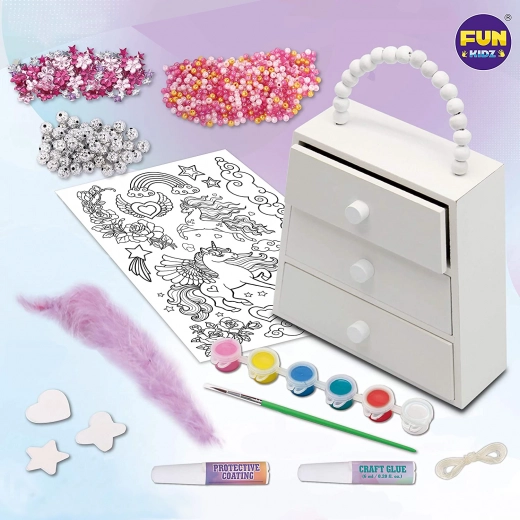 Készítse el saját eredeti fa ékszerdobozát, melynek mérete 20x15x5,5 cm, ezzel a készlettel, amely mindent tartalmaz, amire szüksége lehet. A kreativitásnak nincsenek határai, így saját fantáziája szerint díszítheti. A színes gyöngyök és más díszek egyedülállóvá teszik alkotását.
