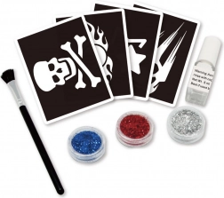 - ecset; 4 sablon (többször használható); tetováló ragasztó; csillámpor 3 színben; útmutató