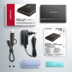Az AXAGON CLONE MASTER 2 praktikus megoldás biztonsági mentéshez, migrációhoz és meghajtók teszteléséhez. A gyors USB 3.2 Gen 2 (10Gbps) interfésznek és a valós, akár 1 000 MB/s átviteli sebességnek köszönhetően gyors adatátvitelt biztosít. Az NVMe M.2 meghajtó csavarok nélkül helyezhető be, a 2.5"/3.5" SATA meghajtók közvetlenül az adapter SATA portjára csatlakoztathatók. A klónozás iránya a kapcsolóval állítható NVMe M.2 → SATA és SATA → NVMe M.2 között.