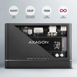 Az SSD-k stabil működéséhez rendelkezésre áll a nagyobb teljesítményt nyújtó UASP, a hosszú távú kondíciót biztosító TRIM és a S.M.A.R.T. monitorozás. Az adapter támogatja a bootolást a csatlakoztatott meghajtókról, az Auto Spindown funkciót tétlenség esetén, valamint a Turn Off lekapcsolást eszközelválasztáskor vagy a PC altatásakor. Az USB-s tápellátás elegendő az M.2 és 2.5" meghajtókhoz, 3.5" HDD-hez a csomagban külső 12 V / 2 A adapter található.