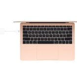 Az arany laptop modern kialakítása megmutatja, hogyan néz ki az adapter egy stílusos eszközhöz csatlakoztatva, ezáltal növelve annak esztétikai értékét.
