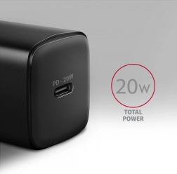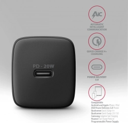 Kompakt AXAGON 20W hálózati töltő egy USB‑C porttal, amely a PD 3.0 / QC 4+ szabványoknak köszönhetően gyorsan feltölti a telefonokat és táblagépeket. Támogatja a legfeljebb 20 W kimenetet, kompatibilis iPhone, Samsung, Huawei, Xiaomi stb. készülékekkel, és fejlett védelmeket kínál a biztonságos töltéshez.