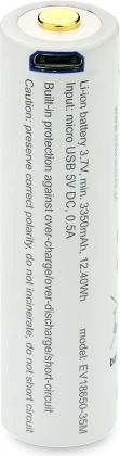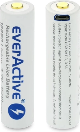Az EverActive 18650 akkumulátor 3500 mAh kapacitással ideális professzionális használatra, köszönhetően az integrált micro USB-nek a közvetlen töltéshez. Ez az akkumulátor eredeti Samsung 35E cellát tartalmaz és PCM elektronikus védelemmel van ellátva, amely megvéd a túlzott lemerítéstől, túltöltéstől és rövidzárlattól.