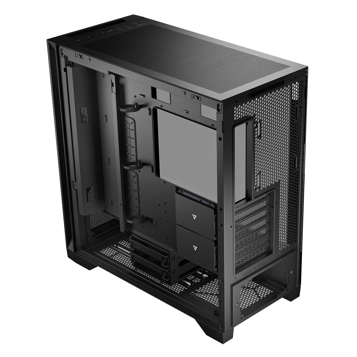 A Volcano Expanse S MIDI váza lehetővé teszi, hogy úgy rendezd be a belsőt, ahogyan az igazán a tiéd! Az alaplap magasságában dedikált hely van a kábelcsatorna vagy egy ventilátorkeret beszerelésére. Rajtad múlik, hogyan használod ki ezt a belső elrendezési lehetőséget. A tálca segít rendben tartani a kábeleket és tisztán tartani a ház belsejét. Ideális megoldás azoknak, akik szeretik jó állapotban tartani a számítógépüket, és különösen értékelik az esztétikát. Ha igazi „játék szörnyet” építesz, és a lehető legjobb hűtést szeretnéd a komponenseidnek, a tálcát kicserélheted három további 120 mm-es ventilátor keretére.