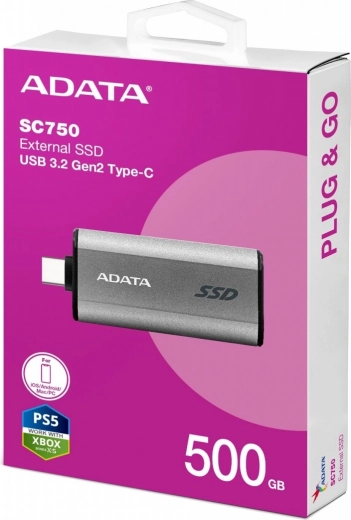 Az ADATA SC750 egy ultrahordozható külső SSD, amelyet útközbeni maximális sebességre és kényelemre terveztek. A USB 3.2 Gen2 (10 Gb/s) interfésznek és az akár 1050/1000 MB/s sebességeknek köszönhetően közvetlenül a meghajtóról dolgozhat, zökkenőmentesen szerkeszthet nagy videófájlokat és azonnal továbbíthat adatokat.