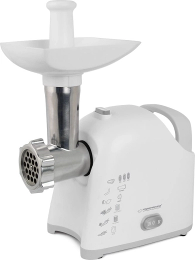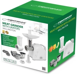 Az ESPERANZA Wellington modern és funkcionális segítőtárs, amely egyesíti a húsdarálót és a reszelőt egy készülékben. Daráló üzemmódban nemcsak a hússal birkózik meg, hanem más élelmiszerekkel is, beleértve a fasírt- vagy pástétomalapok előkészítését. A reszelő üzemmód megkönnyíti a gyümölcs, zöldség, kemény sajt, csokoládé vagy diófélék szeletelését és aprítását – ideális gyors saláták, desszertek és szóratok elkészítéséhez.