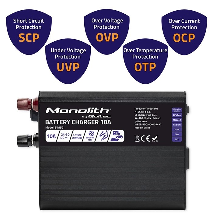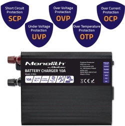Stabil és biztonságos energiaforrás minden típusú akkumulátor számára, mint a LiFePO4, AGM, GEL és SLA. Kompatibilis különböző akkumulátorfajtákkal, a Monolith töltő stabil és biztonságos tápellátást biztosít, így meghosszabbítva az akkumulátorok élettartamát.