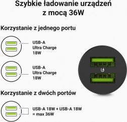 - 36 W összteljesítmény a két eszköz egyidejű, gyors töltéséhez