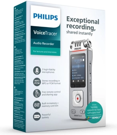 Rögzítsen előadásokat és távoli előadókat kiváló hangminőségben három, nagy pontosságú speciális mikrofonnal. Vegyen fel és vezérelje a diktafont távolról okostelefonos alkalmazással a még nagyobb rugalmasság érdekében. Ossza meg könnyedén a fájlokat a világgal az alkalmazás segítségével. A Sembly AI Speech-to-Text Cloud szoftverrel kombinálva a felvételeket gyorsan és pontosan szöveggé is alakíthatja. Amikor visszatér a számítógéphez, egyszerűen töltse fel a fájlokat a Sembly alkalmazásba, amely automatikusan szöveggé alakítja a felvételeket.