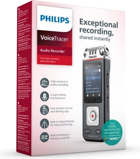 Rögzítsen előadásokat és távoli előadókat kiemelkedő hangminőségben három, nagy pontosságú speciális mikrofonnal. Vegye fel és vezérelje a diktafont távolról okostelefonos alkalmazással a még nagyobb rugalmasság érdekében. Ossza meg fájljait könnyedén az alkalmazáson keresztül. A Sembly AI Speech-to-Text felhő szoftverrel kombinálva a felvételeket gyorsan és pontosan szöveggé is alakíthatja. Amikor visszatér a számítógéphez, egyszerűen töltse fel a fájlokat a Sembly alkalmazásba, és az automatikusan átírja a felvételeket.