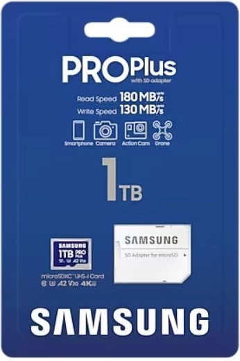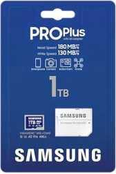 Bővítse eszköze tárhelyét és teljesítményét a SAMSUNG PRO Plus microSDXC 1 TB kártyával és a SD adapterrel. Akár 180/130 MB/s (olvasás/írás) sebességet kínál, U3, V30, A2 besorolással 4K videóhoz és igényes alkalmazásokhoz, valamint 6-szoros védelemmel víz, hőmérséklet, röntgensugárzás, mágneses tér, esések és kopás ellen. Ideális Android okostelefonokhoz, tabletekhez, akciókamerákhoz, drónokhoz és játékkonzolokhoz is.