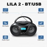 Ez a hordozható sztereó rádiólejátszó sokoldalúságot és egyszerű kezelhetőséget kombinál. A CD/MP3, USB és Bluetooth támogatásnak köszönhetően könnyedén lejátssza zenéit lemezekről, pendrive-ról és mobil eszközökről is. A PLL digitális FM tuner stabil adásvétele biztosított, míg a megvilágított LCD kijelző egyértelmű áttekintést nyújt a kiválasztott funkciókról.