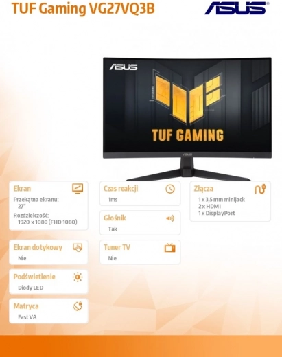 Az ASUS TUF Gaming VG27VQ3B egy 27"-es gamer monitor, amely az immerszív élményért ívelt kijelzőt, villámgyors 1 ms reakciót és praktikus 2× HDMI valamint DisplayPort csatlakozást kínál. A játékosokra szabott fejlesztéseknek és a masszív TUF felépítésnek köszönhetően ideális azoknak, akik kompromisszumok nélküli, stabil teljesítményt szeretnének.