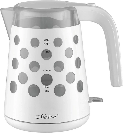 A Maestro KROPKI fehér vízforraló ideális minden konyhába. Az 1,7 literes kapacitás és a 2200 W teljesítmény gyors vízforralást biztosít. Az elrejtett fűtőelem nemcsak az esztétikát javítja, hanem megkönnyíti a tisztítást is, miközben a kék LED világítás modern megjelenést kölcsönöz.