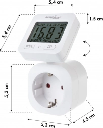 A kezelés intuitív – rendelkezésre áll 2 funkciógomb a gyors üzemmódváltáshoz. A forgatható, jól olvasható kijelző bármilyen helyzetben kiváló láthatóságot biztosít. A készülék akár 3680 W terhelést is elbír, így gond nélkül méri a nagyobb igényű berendezéseket is, mint a mosógép, szárítógép vagy PC.
