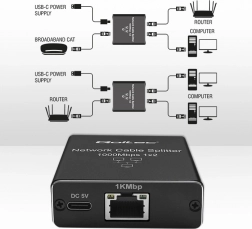 Kompakt RJ45 splitter/switch, amely lehetővé teszi a hálózati jel két kimeneti vonalra osztását akár 1 Gbps sebességgel és akár 100 m távolságon. 3 RJ45 portot kínál (1× bemenet, 2× kimenet), tartós alumínium házat, aranyozott csatlakozókat és egyszerű Plug & Play telepítést bonyolult konfiguráció nélkül.