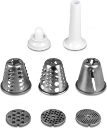 A gazdag felszereltség sokoldalú konyhai eszközzé teszi a darálót: három 3/5/8 mm-es darálótárcsa a kívánt struktúrához, kolbásztöltő és kebbe-feltét, valamint reszelőkészlet az új burgonyareszelővel. A praktikus beépített tároló a használaton kívüli tárcsákat fogadja, a kolbász- és kebbe-alkatrészek pedig a nyomórúdba kerülnek. Így készíthet darált húst, házi felvágottakat, pástétomokat, tócsnit, friss salátákat és reszelt sajtot.