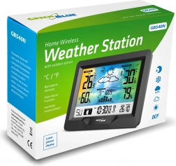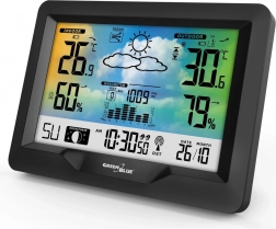 Modern, vezeték nélküli GREENBLUE időjárás-állomás színes kijelzővel, DCF rádióvezérelt idővel, beltéri és kültéri hőmérséklet- és páratartalom-méréssel, barométerrel, holdfázisokkal és grafikus időjárás-előrejelzéssel. A vezeték nélküli érzékelőnek köszönhetően akár 60 m távolságig figyeli a körülményeket, a komfortjelző pedig segít egészséges klímát fenntartani otthon.