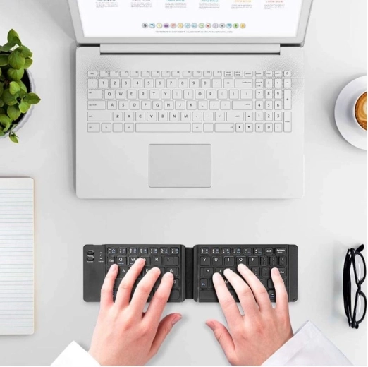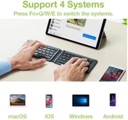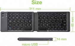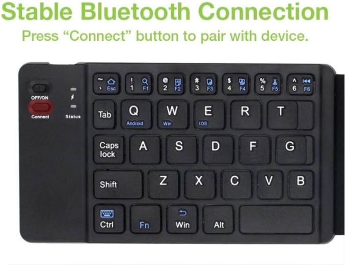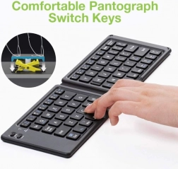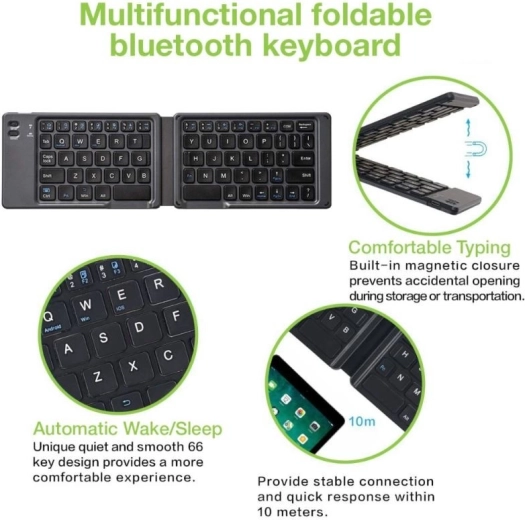 Összecsukható Bluetooth V3.0 billentyűzet: a szabványos méret növeli a gépelés teljesítményét és kényelmét; alacsony tömegének és kompakt, összecsukott méreteinek köszönhetően könnyen magával viheti bárhová, és egyszerűen használhatja okostelefonokkal és táblagépekkel. A Bluetooth technológia akár 10 méteres hatótávon belül biztosít vezeték nélküli kapcsolatot.