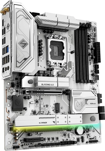 A lap modern felszereltséget kínál a gyors grafikus kártyákhoz és tárhelyhez: PCIe 5.0 x16 a GPU számára, egy Blazing M.2 (PCIe Gen5 x4) és több Hyper M.2 (PCIe Gen4) az NVMe SSD-khez. A hálózati kapcsolatot a Realtek 2.5G LAN biztosítja, vezeték nélkül pedig a legújabb Intel Wi‑Fi 7 + Bluetooth. Alkotói munkához és fejlett perifériákhoz a Thunderbolt 4 Type‑C portok sem hiányoznak.