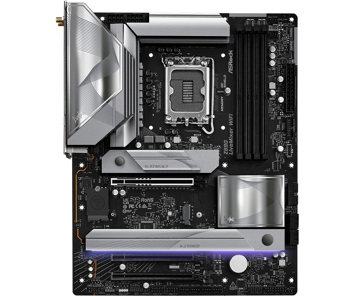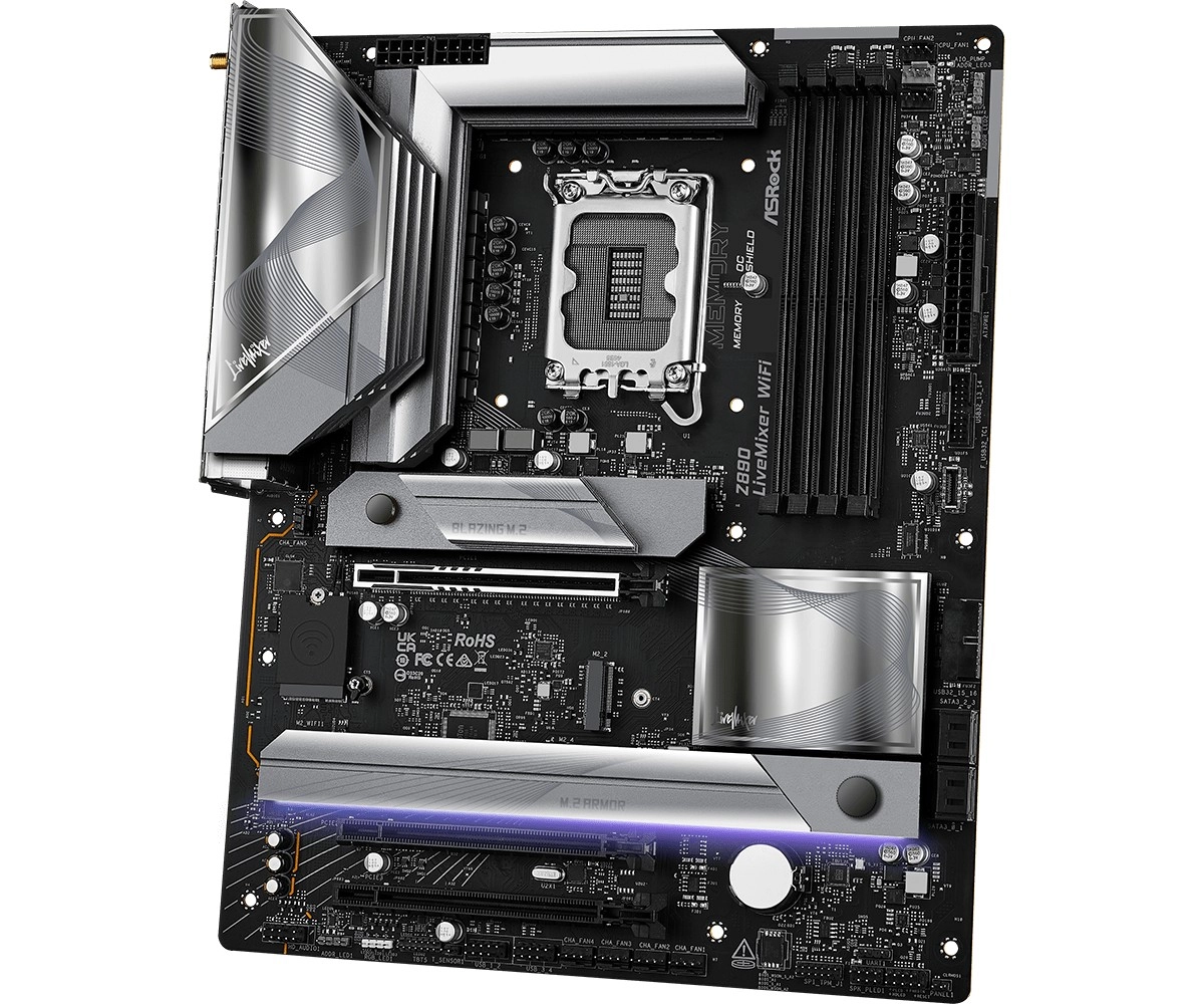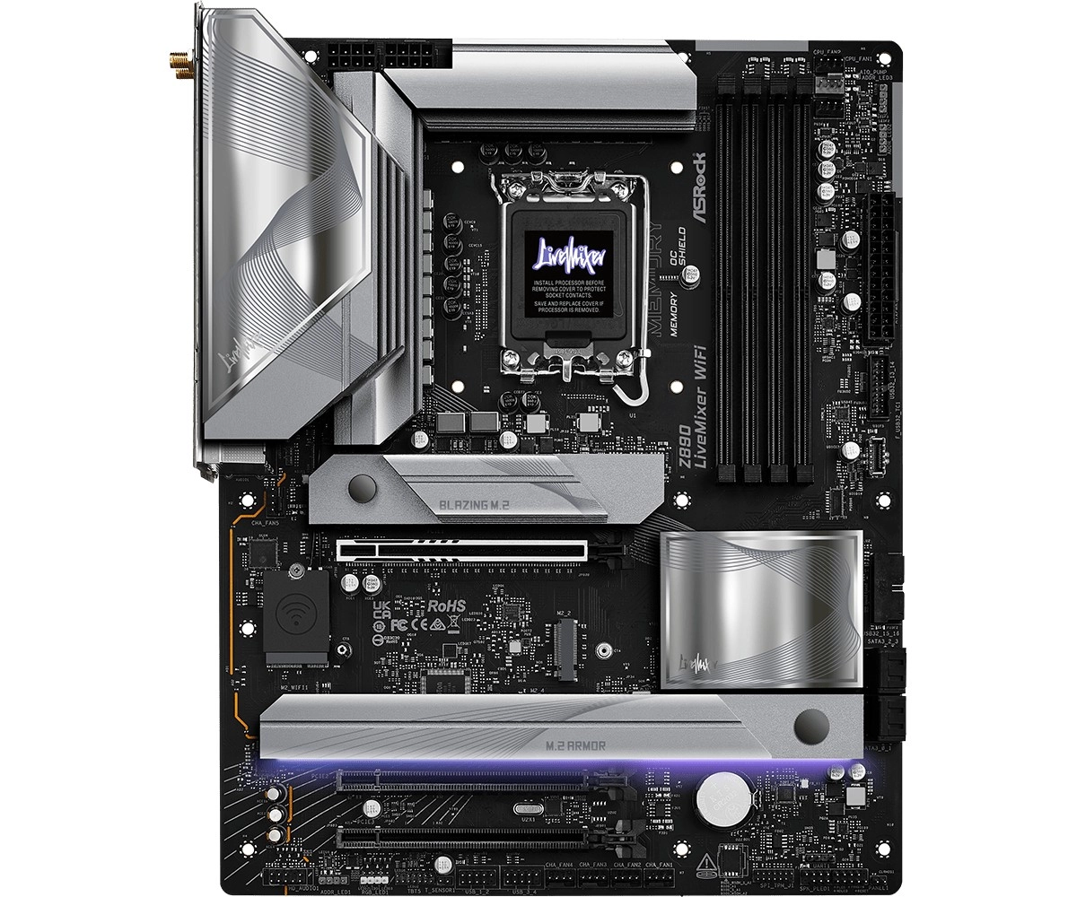 A LiveMixer sorozat modern alkotók számára készült. Az ASRock Z890 LiveMixer WiFi a robusztus 18+1+1+1+1 tápfázist (80 A SPS a VCore+GT+SA számára) ötvözi a csúcsszintű bővítési lehetőségekkel: PCIe 5.0 x16 a legújabb videokártyákhoz, három M.2 foglalat, köztük a Blazing M.2 PCIe Gen5 x4, valamint két Thunderbolt 4 Type‑C az ultragyors periféria- és kijelzőcsatlakozáshoz.