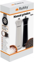 Elegáns RUHHY kézi őrlő szett két darabban, fekete és fehér színben a frissen őrölt sóhoz és borshoz. Kerámia őrlőmechanizmussal, fokozatmentes szemcseméret-állítással és ergonomikus formával a kényelmes használatért. A minőségi anyagoknak és a modern dizájnnak köszönhetően az őrlők tartósak, pontosak és könnyen tisztíthatók.