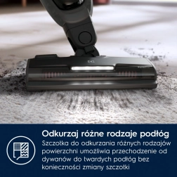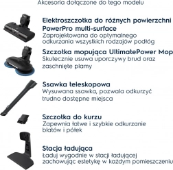 A porszívó tartozékai: PowerPro Multifloor elektromos kefe szőnyegekhez és keménypadlókhoz LED-világítással, PowerPro Mop felmosókefe, teleszkópos réstisztító fej, portalanító kefe, töltőállomás. A kézi egységhez és a mellékelt tartozékokhoz való könnyű hozzáférés lehetővé teszi a különböző felületek alapos és gyors porszívózását – a padlótól a nehezen elérhető sarkokig.