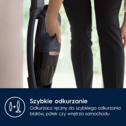 Ismerje meg a kényelmes és rugalmas porszívót kiváló ergonomikus kialakítással. A kézi egység könnyen levehető a rúdról a gyors rendrakáshoz és a nehezen elérhető helyek eléréséhez.