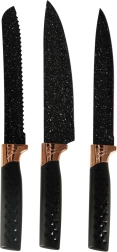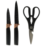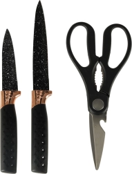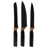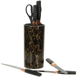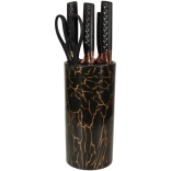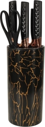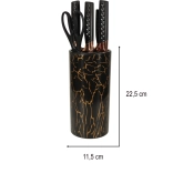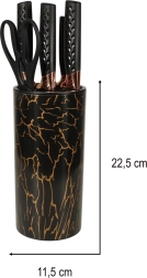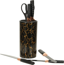 Fedezze fel a kivételes dizájnt fekete és réz akcentusokkal, amelyek javítják a konyhája megjelenését. A márványtalapzat praktikus és esztétikus tárolási megoldást biztosít, amely rendezetten és könnyen elérhetővé teszi a késeit.