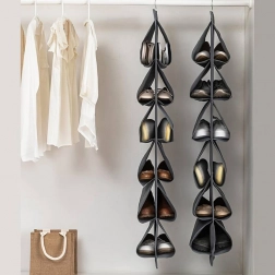 Praktikus és elegáns megoldás minden gardróbba. A 12 zsebes függő cipőrendező vertikálisan tárolja a párokat, így több helyet és jobb áttekinthetőséget nyer. A tartós anyag megerősített varrásokkal óvja a cipőket a kopástól és a portól, a fém akasztó pedig stabil függesztést garantál.