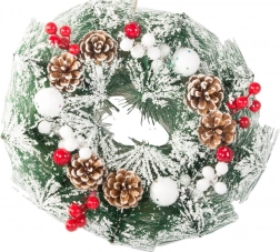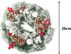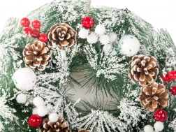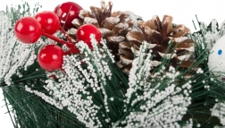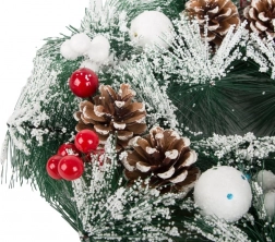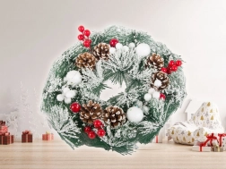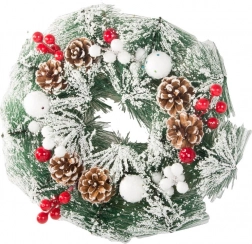 Elegáns karácsonyi koszorú természetes tobozokkal, piros bogyókkal és havas hatással, amely otthonának ünnepi hangulatot kölcsönöz. Könnyű szerkezete lehetővé teszi az egyszerű felakasztást ajtóra, ablakra és falra, és tartós anyagainak köszönhetően beltérben és védett kültéren egyaránt használható.