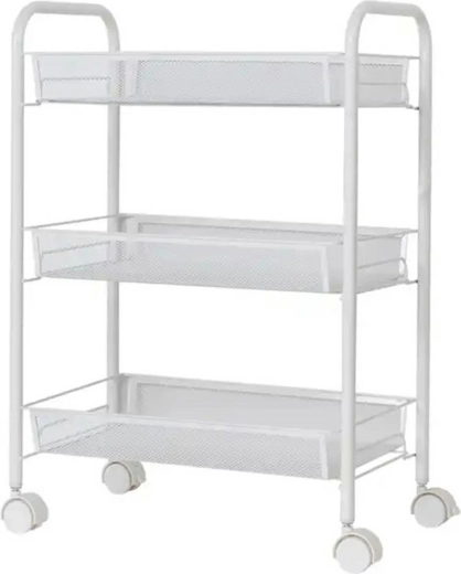 Univerzális gurulós konyhai polcrendszer kerekekkel. Három mély polccal felszerelve, amelyek sok kiegészítőt képesek befogadni. További öt levehető horog teszi lehetővé a konyharuhák vagy törölközők kényelmes felakasztását a kocsi széleire. Az egyik pár kerék fékkel rendelkezik, amely lehetővé teszi a rögzítést és az elhelyezést tetszőleges helyen. Mobil kialakításának köszönhetően rendkívül sokoldalú.