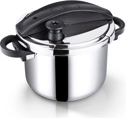 A fedél egykezes gombnyomással nyitható, így a konyhai munka gyors és kényelmes. A beépített manométer és a többszintű biztonsági szelepek nyugalmat adnak főzés közben, míg a szendvics alj egyenletesen oszlatja el a hőt minden tűzhelyen, beleértve az indukciós főzőlapokat is.