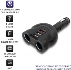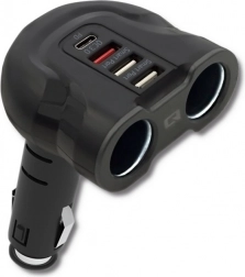 A praktikus Qoltec autós elosztó 2 szivargyújtó aljzattal és USB portokkal bővíti a tápellátást az autóban a gyors töltéshez. 12–24 V feszültséget támogat, 52 W teljesítményt kínál, USB QC 3.0, USB‑C Power Delivery és USB Smart funkcióval a telefon, tablet, navigáció és egyéb eszközök biztonságos és gyors egyidejű töltéséhez.