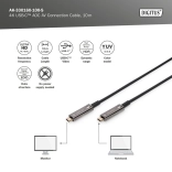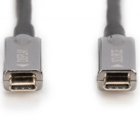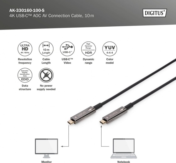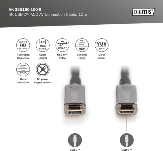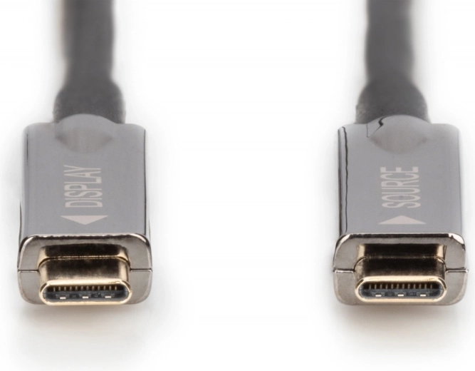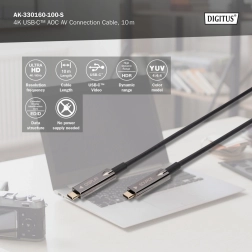 Aktív hibrid USB‑C–USB‑C kábel tömörítetlen kép és hang továbbításához akár UHD 4K @ 60 Hz felbontásig, akár 21,6 Gbit/s átviteli sebességgel. Optikai‑réz kialakításának köszönhetően könnyű, rugalmas és ellenáll az EMI‑nek, ideális hosszabb távolságokra (10 m). Támogatja a DisplayPort 1.2‑t és az USB‑C DP Alt Mode‑ot, plug and play módon működik, külső tápellátás nélkül.