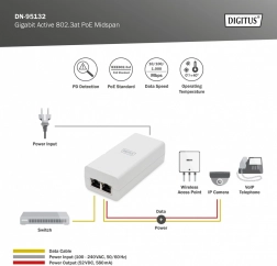 Beltéri használatra szánt aktív midspan PoE injektor, amely egyetlen Ethernet-kábelben egyesíti az adatot és a tápellátást, jelentősen egyszerűsítve a hálózati eszközök telepítését. Támogatja az IEEE 802.3at (PoE+) szabványt, visszafelé kompatibilis az IEEE 802.3af-fel, 52 V DC / 0,58 A (legfeljebb 30 W) kimenetet biztosít, és 10/100/1000 Mb/s sebességekkel működik. Két RJ45 portja (LAN és PoE) lehetővé teszi a zökkenőmentes tápellátást és adatátvitelt akár 100 méterig Cat5e/Cat6 kábelen.