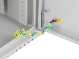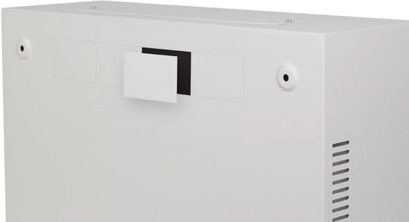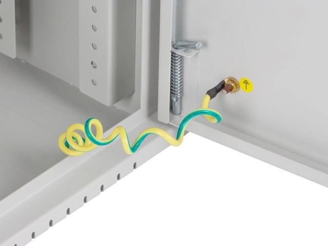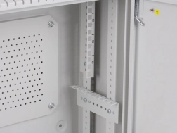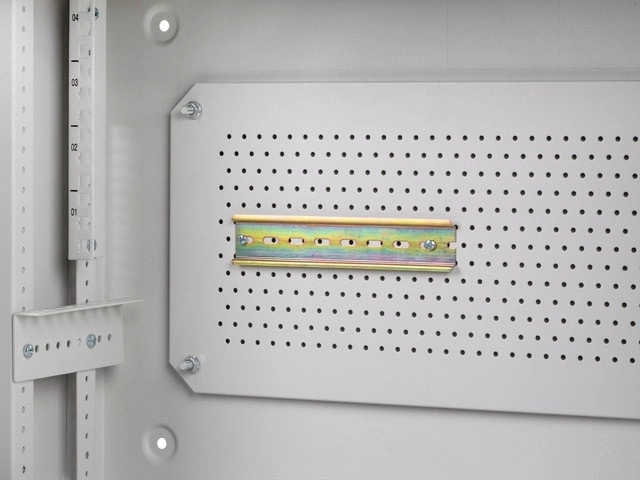 A hátoldalon perforált (mesh) szerelőlemez található M4-es csavarokhoz, továbbá mellékelt DIN sín a tartozékok egyszerű rögzítéséhez. Nem hiányzik a földelő vezeték, a fali rögzítő dübelek és az M6-os csavarok sem a stabil és biztonságos rögzítéshez. Nyolc kitörhető kábelátvezető a hátsó panelen rugalmasságot ad a tápkábelek és adatkábelek vezetéséhez.