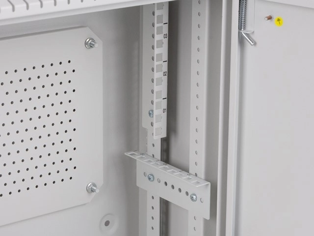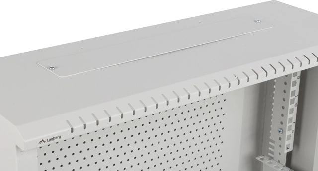 A szekrény teljesen összeszerelve érkezik egy csomagban. A két oldalról nyitható ajtó egyszerűsíti a szervizelést és a hozzáférést. Az integrált szellőzőnyílások a felső, alsó és oldalsó paneleken biztosítják a légáramlást és a stabil belső hőmérsékletet. A lecsavarozható kábelkarmantyúk lehetővé teszik a LANBERG kefe-panelek beépítését, és rendet tartanak a kábelezésben.